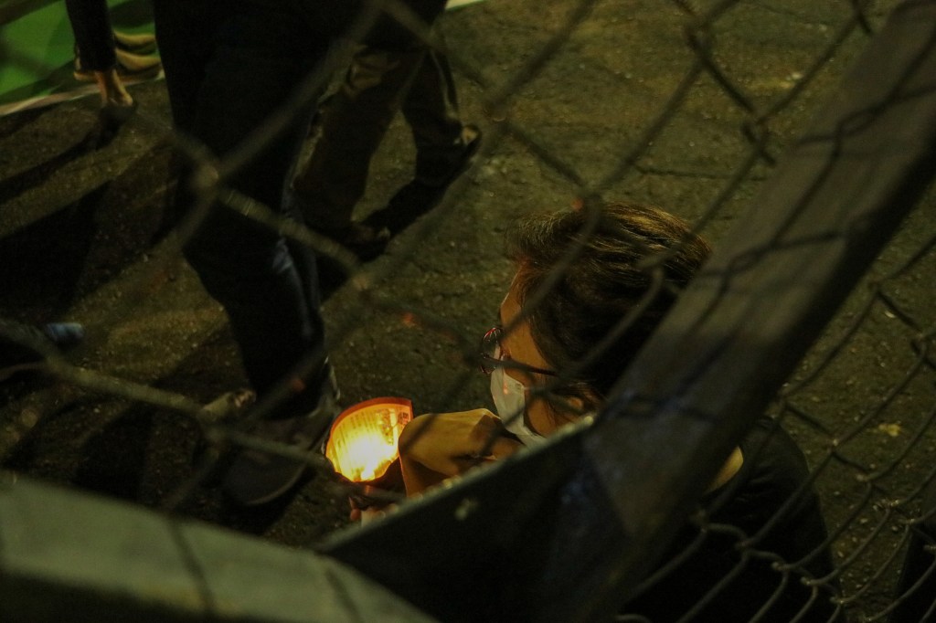 Woman holds a candle at the Tiananmen square massacre memorial in Victoria park