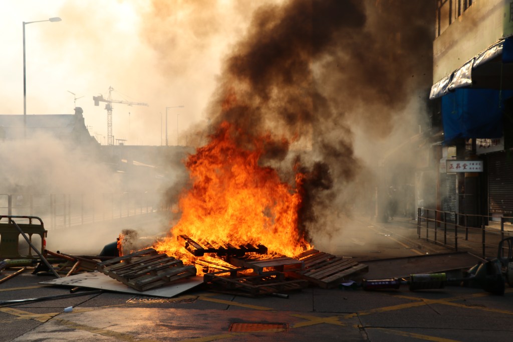 Protestors create a bonfire to keep riot police away